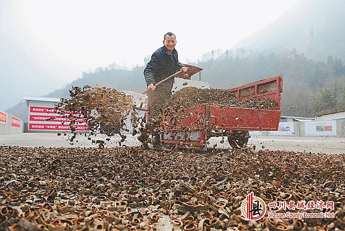 2月15日,位于绵阳市北川县擂鼓镇的本草易中药材前处理基地内,负责人李兴贵在晾晒厚朴。