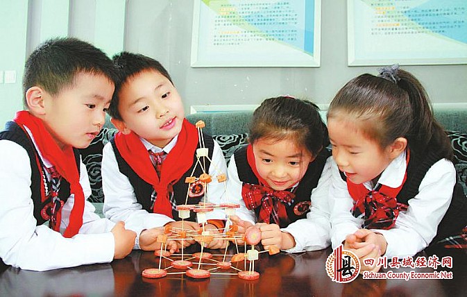 成都市双林小学科技馆内学生在观察萝卜牙签塔。李燕 摄