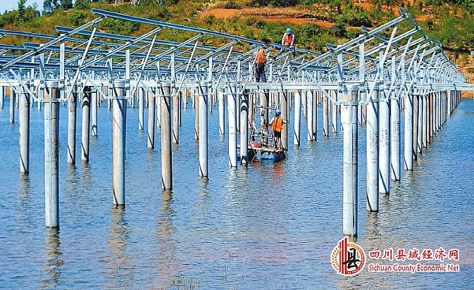 西昌市西溪乡兴国寺水库,建设中的“渔光一体”光伏电站。该项目是我省首个智能鱼塘光伏电站。建成后将实现水上清洁发电、水下现代化养殖、有机种植、生态农业观光旅游的循环经济模式。
