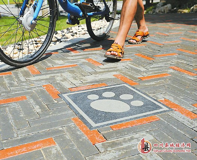 熊猫绿道样板段上铺装的熊猫脚印地砖