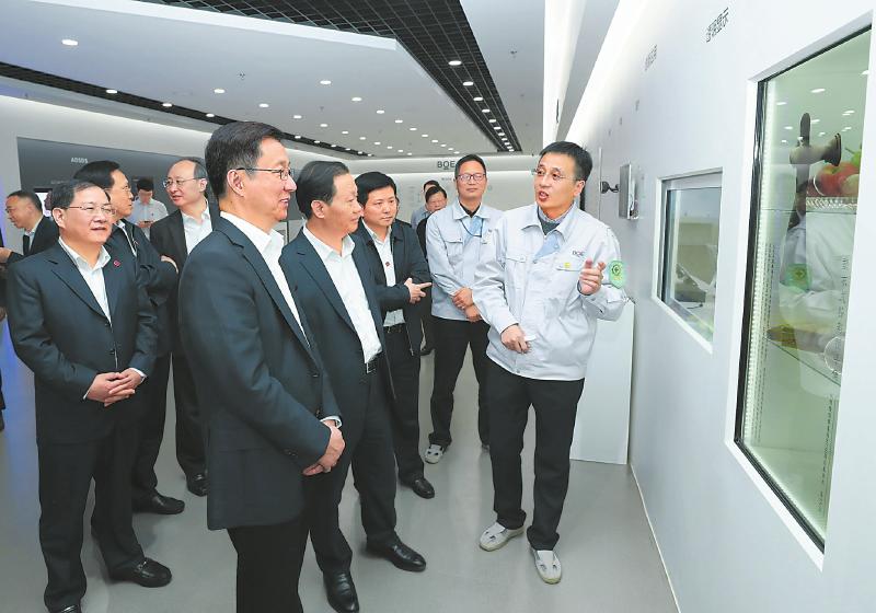 10月8日至9日,中共中央政治局常委、国务院副总理韩正在四川成都调研“一带一路”建设、自由贸易试验区发展、城市规划建设和企业科技创新等情况。这是10月9日,韩正考察成都京东方光电科技有限公司。(新华社记者 庞兴雷 摄)