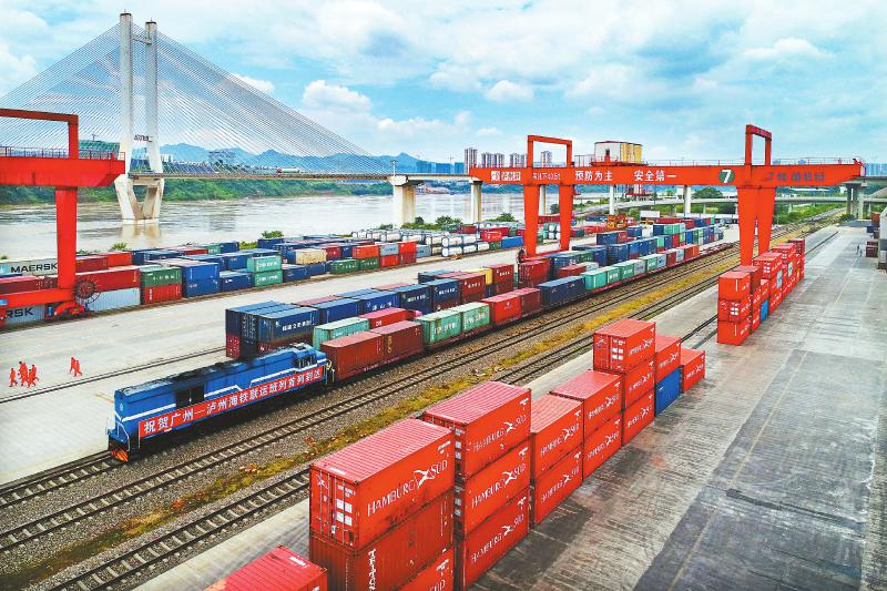 7月12日11时许,首趟广州港—泸州港海铁联运班列抵达泸州港国际集装箱码头进港铁路专用线,标志着泸州—广州外贸铁海联运双向通道正式打通,泸州—广州铁海联运班列实现常态化运行。牟科摄(资料图片)