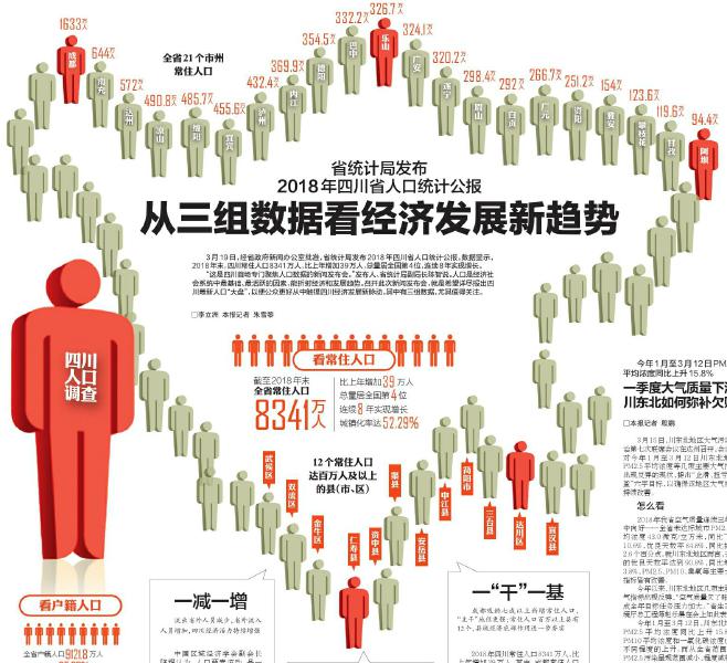 3月19日,经省政府新闻办公室批准,省统计局发布2018年四川省人口统计公报。数据显示,2018年末,四川常住人口8341万人,比上年增加39万人,总量居全国第4位,连续8年实现增长。