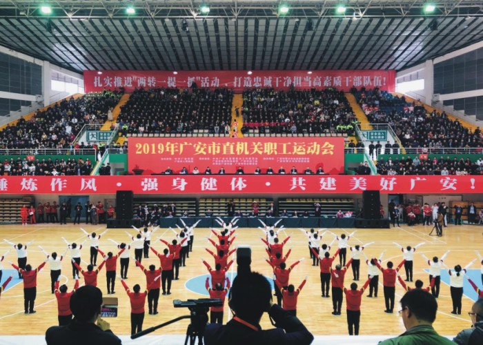 开幕式结束后, 2019年广安市直机关职工运动会第九套广播体操比赛正式进行,伴随着欢快嘹亮的乐曲, 8支代表队的选手共同表演了第九套广播体操,选手们以刚劲有力、整齐划一的动作赢得了观众阵阵掌声。(彭志萍 肖春艳)