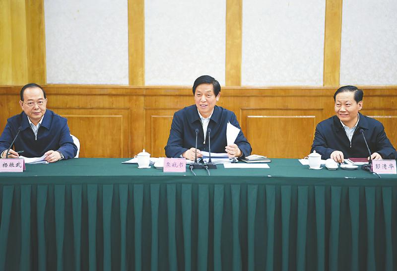 4月8日至11日,中共中央政治局常委、全国人大常委会委员长栗战书率领全国人大常委会执法检查组在四川检查水污染防治法实施情况。这是4月10日,栗战书在省人大常委会机关主持会议同地方人大负责同志和部分全国人大代表、地方各级人大代表座谈。 新华社记者燕雁摄