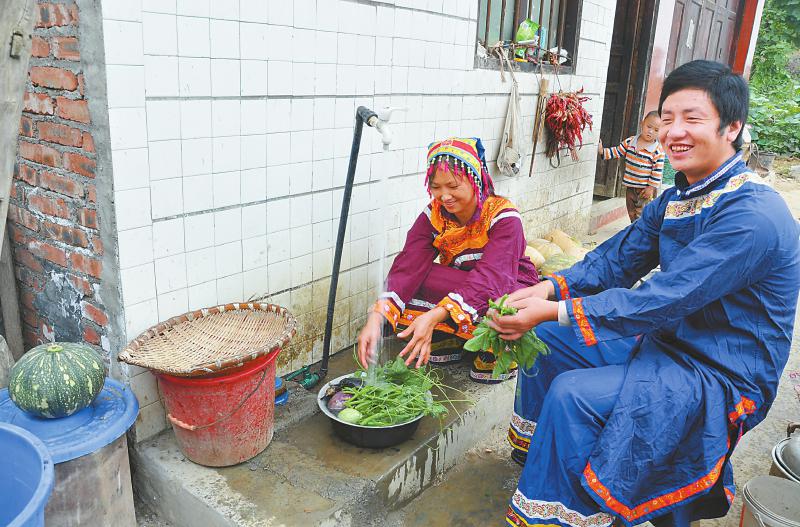 4月底,叙永县水潦彝族乡水潦村,村民李明龙夫妇在自来水管前洗菜。省水利厅供图