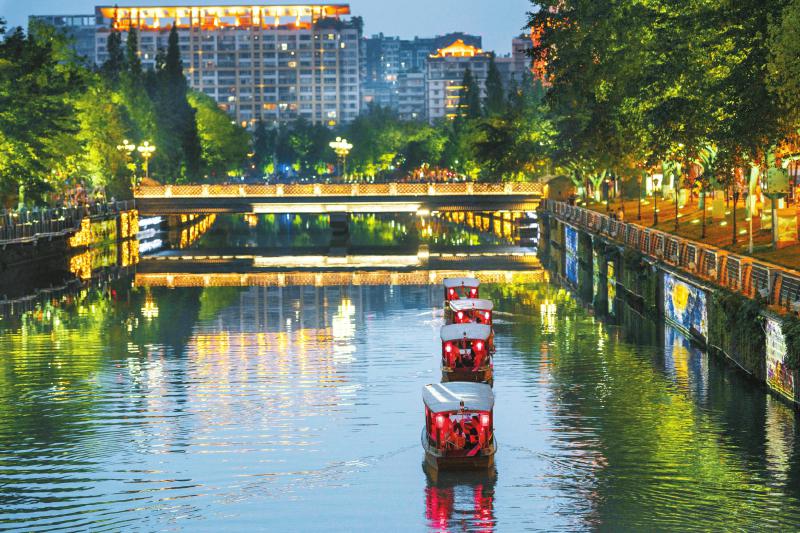 夜游锦江 市民乘船夜游锦江,可观赏两岸动态展示的“门泊东吴万里船”和“花重锦官城”的优美画卷。记者 尹钢 摄