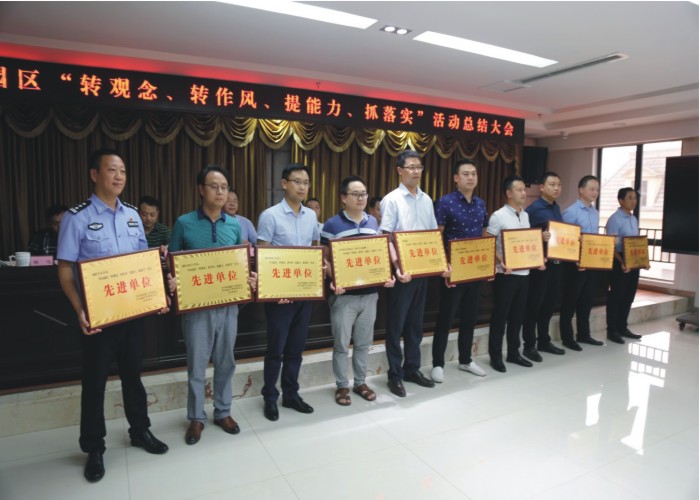 会议还对园区“两转一提一抓”活动中的先进单位进行了表扬并授予奖牌,先进单位代表穿石乡、规划建设局、枣园集团、广安三中分别结合自身工作开展情况作了交流发言。