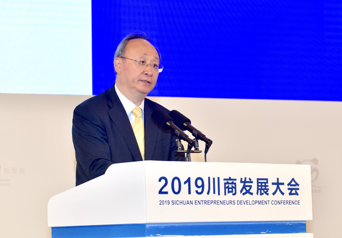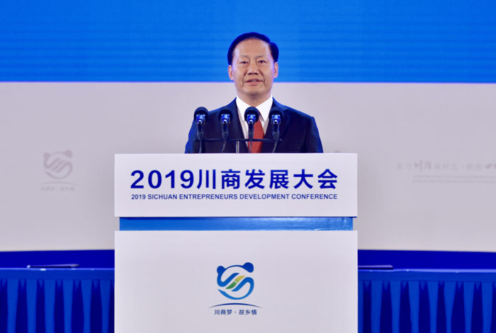 樊友山在致辞中代表全国工商联对2019川商发展大会召开表示热烈祝贺,向海内外远道回乡的企业家表示诚挚问候。他说,本次川商发展大会是在全国上下喜迎新中国成立70周年,全党深入开展“不忘初心、牢记使命”主题教育,四川全面推进“四向拓展、全域开放”战略部署进程中的一件盛事、喜事。大会也是我国民营企业在新时代发展壮大的一个缩影,是我国民营企业家特别是广大川商精神风貌的一次展示,必将浓墨重彩地写入四川经济社会发展的历史。希望广大川商正确看待当前形势,保持定力、坚定信心,围绕国家整体战略,优化布局、找准方向,努力实现高质量发展,在创新、创造、创富中拿出川商方案,打造川商传奇、成就川商经典。
