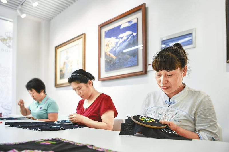 邛崃市夹关镇,绣娘们在杨华珍藏羌刺绣工作室绣制订单产品。记者 杨树 摄