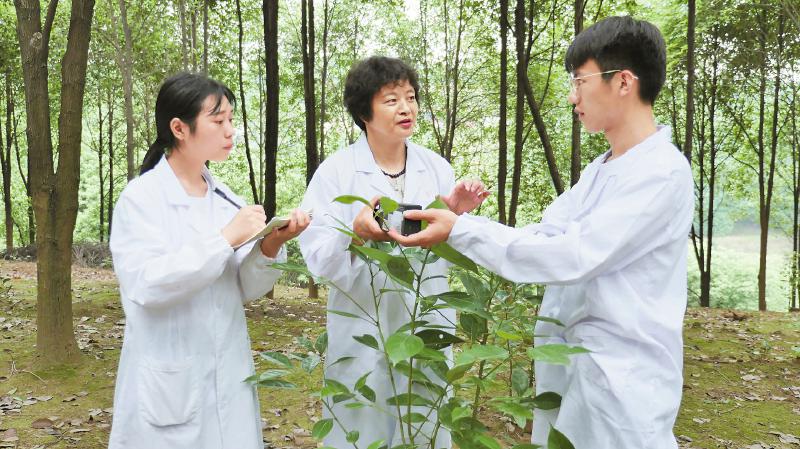 农工党宜宾市委副主委、宜宾学院教授魏琴(中)研究油樟苗种植培育。宜宾市叙州区委统战部供图(资料图片)