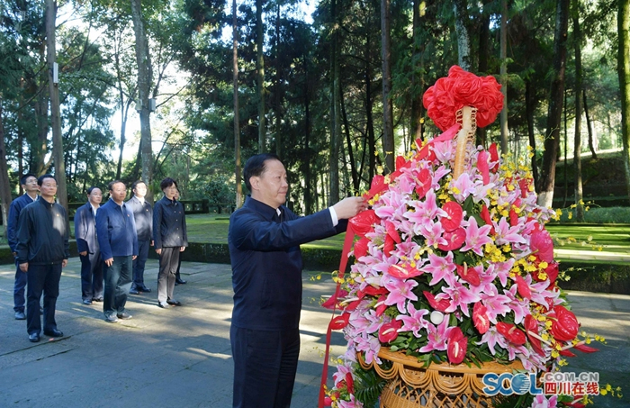 秦巴山区的巴中市通江县,是全国第二大苏区——川陕苏区首府所在地,是川陕革命根据地的核心区域。坐落在通江县沙溪镇王坪村的川陕革命根据地红军烈士陵园,长眠着25000多名红军英烈,是全国安葬红军烈士最多的陵园。彭清华专程来到红军烈士陵园,瞻仰红四方面军烈士纪念碑,深情缅怀革命先烈在川陕苏区浴血奋战的峥嵘岁月。在纪念碑前,彭清华向革命先烈敬献花篮并三鞠躬,缓步来到红军烈士集中墓葬区献上鲜花,绕行瞻仰“川陕忠魂”雕塑和红军烈士纪念墙,表达对红军英烈的无限崇敬之情。