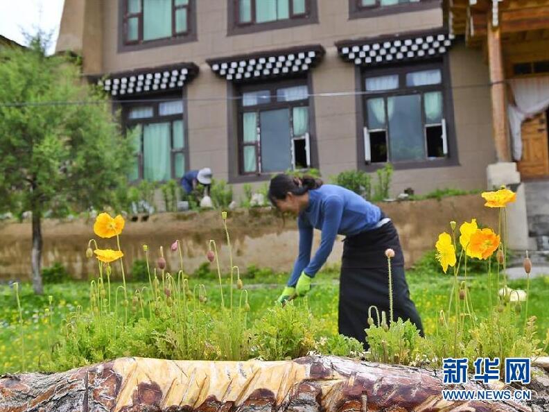 6月15日,神座村村民扎西许措在整理院子,准备迎接游客的到来。 新华社记者刘坤摄