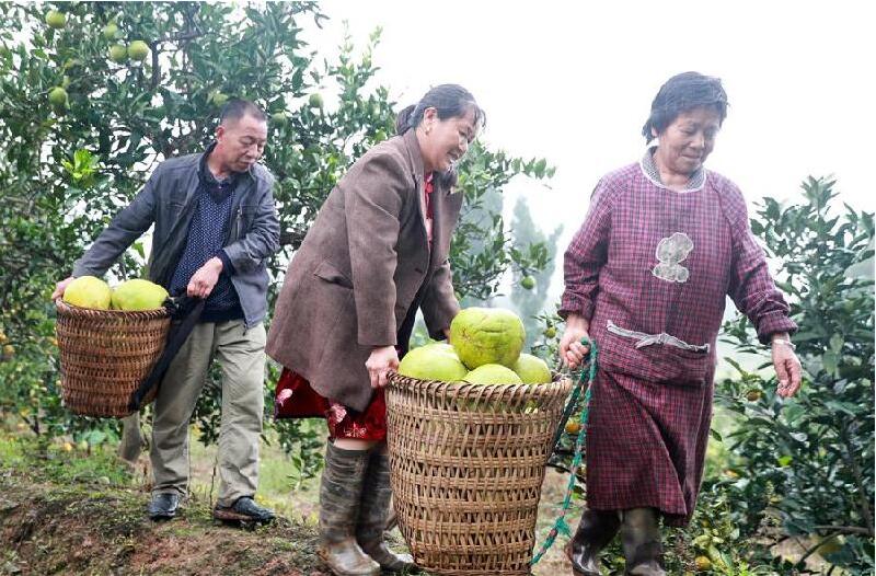 10月11日,四川省华蓥市禄市镇山门口村村民在搬运采摘的蜜柚。