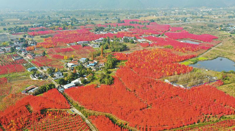 这是11月19日航拍的绵竹市九龙镇双泉村红叶。初冬时节,双泉村一个苗圃的500多亩“夕阳红”北美红枫层林尽染,吸引了不少游人。当地加强该区域观光步道建设及农房风貌改造,发展乡村旅游,助力乡村振兴。
