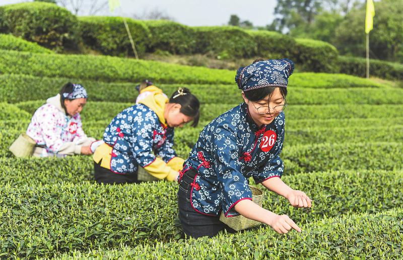 3月15日,成都市蒲江县成佳镇同心社区,茶姑们正在比赛采茶技能。当地举行为期3个月的采茶节系列活动,采茶制茶比赛、茶园车迷健身节、早春茶市、茶文创体验、茶乡美食之旅等活动相继开展,促进了当地茶产业和乡村休闲旅游业的发展。