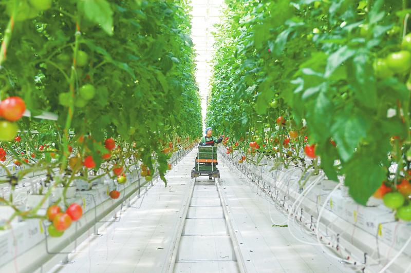 4月10日,内江市资中县银山镇现代农业园区,村民在智慧温室大棚内采收番茄。近年来,内江市大力发展设施农业,将智能温控和无土栽培等技术应用于农业生产,促进农业增效、农民增收。