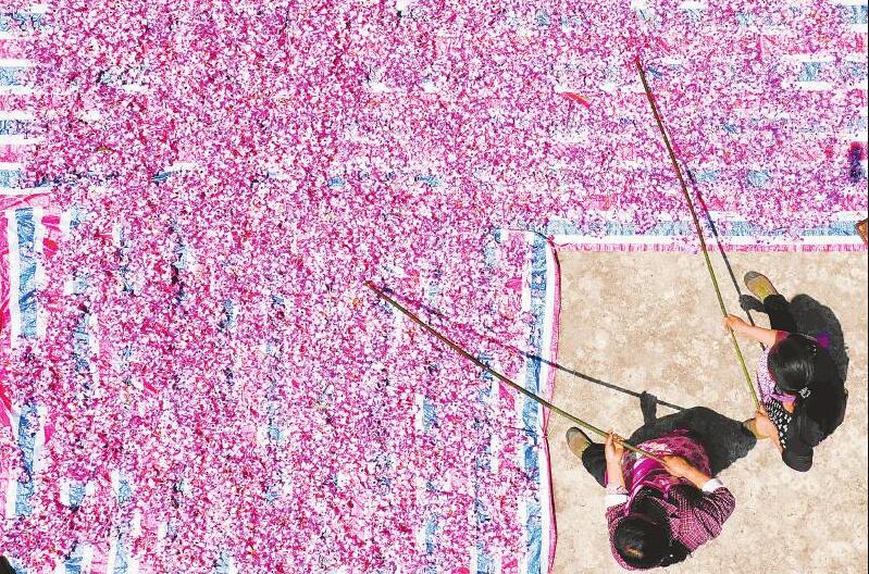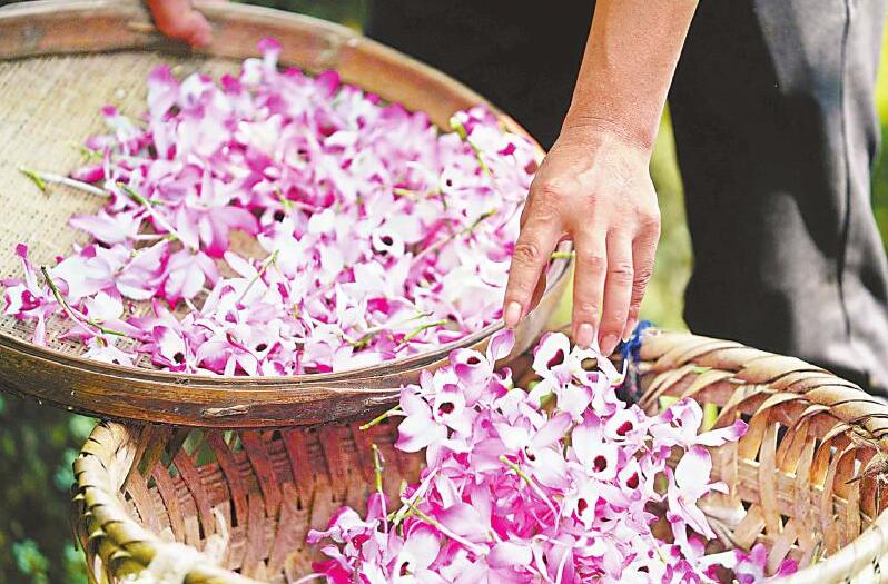 5月19日,泸州市合江县福宝镇渡口村村民在晾晒金钗石斛鲜花。金钗石斛为中国传统中药材,被国际药用植物界称为“药界大熊猫”。近年来,合江县引导村民因地制宜打造集“药用+观赏”为一体的农旅金钗石斛产业园,提升金钗石斛附加值,促进村民增收。