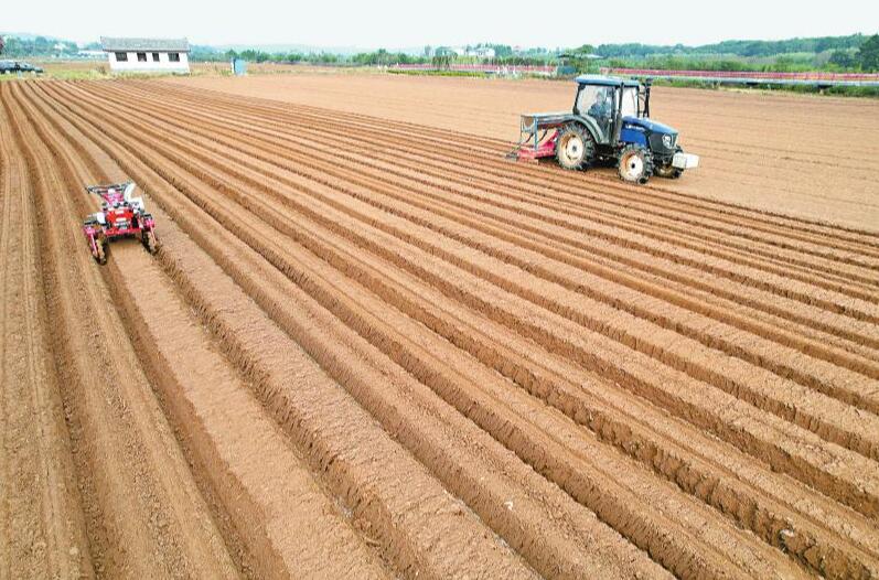 10月10日上午,在绵阳市游仙区新桥镇胜利村,种植户驾驶大型农机,边开垄边施肥。一台小型无人驾驶农机紧随其后,为垄沟里的肥料覆土。这片经过平整的土地有300多亩,将种植白萝卜和青菜。 王勇 摄(C视觉)