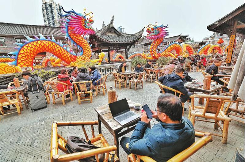 人民公园鹤鸣茶社,市民在龙凤呈祥灯组前拍照打卡。 本组图片均由四川日报全媒体记者 华小峰 摄