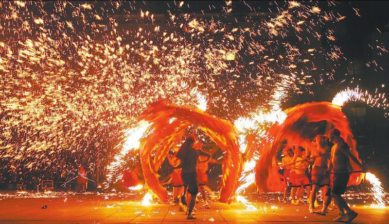 1月31日晚,民间艺人在南充市蓬安县相如广场表演国家级非物质文化遗产“火龙钢花”。伴随着喜庆的乐曲,温度高达1500摄氏度的铁水被拍打至高空,瞬间绽放成朵朵“钢花”漫天飞舞,舞龙者在飞舞的火花间舞动穿梭,演绎出“人在龙中舞,龙在火中飞”的壮观画面,让广大市民感受到浓浓年味。