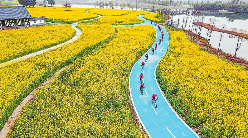二月二十日,眉山市彭山区五湖四海湿地公园上千亩油菜花盛开,吸引众多骑行爱好者前来骑行赏花。翁光建摄(视觉)C