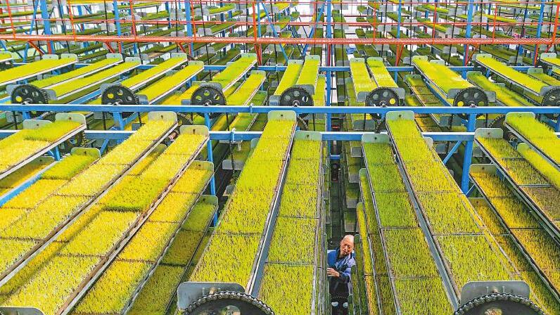 3月22日,在眉山市彭山区公义镇的数智水稻示范基地,一排排循环式智能育秧机正全天候运行,农技人员正在观察水稻秧苗生长情况。玻璃大棚外,工人们利用秧盘智能传输带将育秧车间长出嫩芽的秧盘运送田间,通过补土、施肥、覆膜进行水稻秧苗培育。(翁光建 摄 C视觉)