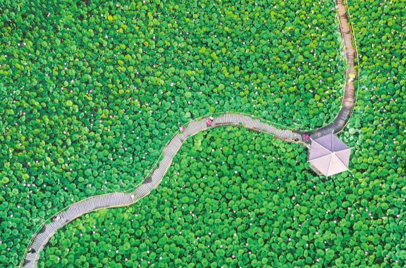 夏日里,雅安各地的荷花陆续绽放。6月20日,雅安市雨城区西城街道青元村的荷塘栈桥上,游客在打卡拍照。 雅安观察 黄刚 摄
