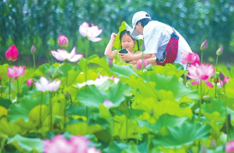 7月22日,芦山县龙门镇,龙兴之野·河谷印象田园近百亩荷花盛放,吸引市民游客观赏拍照。雅安观察 黄刚 摄