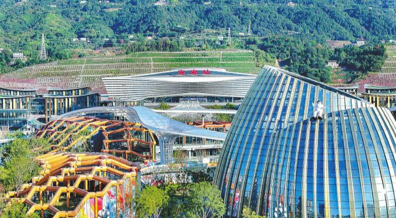 2024年10月17日,四川省宜宾市叙州区高铁宜宾站。宜宾站站前广场项目占地约980亩,项目正在建设“竹颂塔楼”总部基地和酒店,竹笋造型的城市艺展中心、马门溪龙造型地标建筑已经建好并投入使用,23万平方米商业街区、城市绿芯公园、人才公寓正在逐步建设完善。张元戎 摄(C视觉)