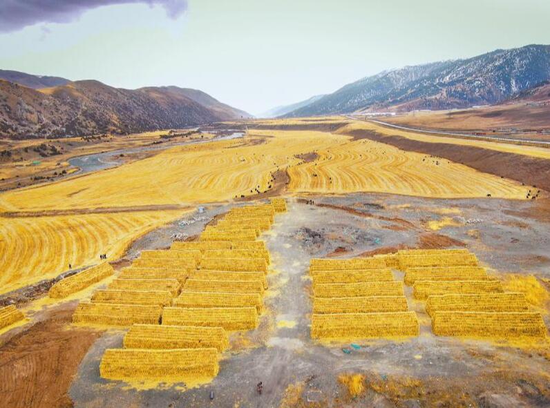 牧业发展,草业先行。近年来,德格县坚持“立草为业、化草为粮”,加快推进饲草产业发展升级,2024年共规模化集中种植燕麦草12000亩。近日,燕麦草进入收获期,经估算鲜草平均亩产3000公斤,可获得青干草每亩500公斤左右。图为收割完的饲草被堆成草垛。 甘孜观察 洛绒尼玛 摄