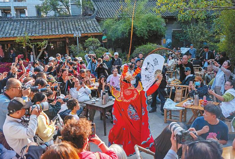1月5日,在成都市青羊区社区茶社里,市民和游客晒着冬日暖阳,一边喝茶一边欣赏变脸表演,格外舒适惬意。