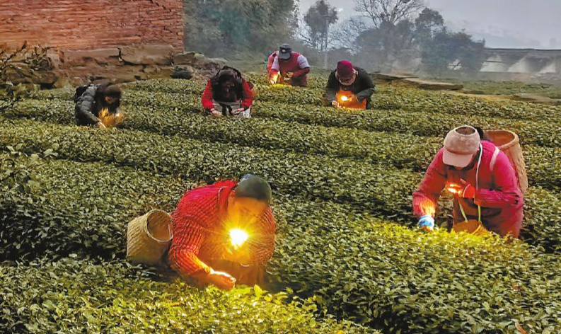 2月18日清晨5点多,自贡荣县保华镇大湾村的一处茶园里,茶农正挑灯采摘“峨眉问春”早茶。李秋玥 摄(C视觉)