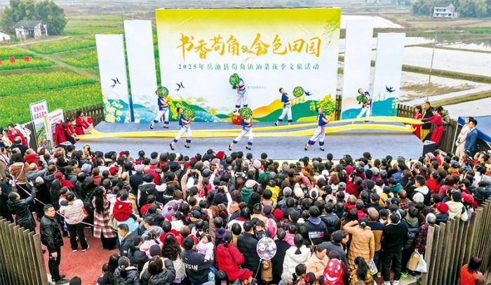 3月8日,岳池县苟角镇曾拱桥村热闹欢腾。上午10时许,“书香苟角·金色田园”2025年岳池县苟角镇油菜花季文旅活动在此启幕,万名游客齐聚,共赴一场春日盛宴。