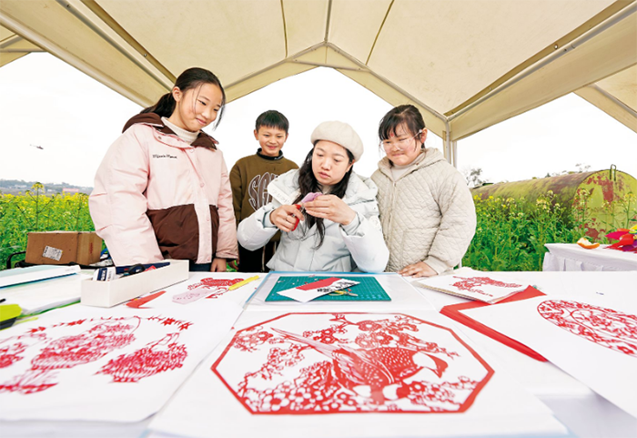 在非遗手作工坊,剪纸艺人和糖画师傅现场展示传统手工艺,游客纷纷动手尝试,感受传统文化的魅力。在农趣运动区,游客们参与拔河、挑扁担等传统运动,体验农耕生活的乐趣。