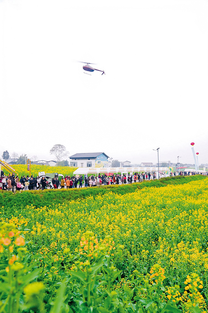 走进油菜花田,金黄色的花朵在微风中摇曳生姿,散发阵阵芳香。乘坐直升机从空中俯瞰,一块块油菜花田相连成片、绵延不绝,与村庄、道路、游人交相辉映。现场还设置了观景平台、花海小径等多个拍照打卡点,游客们在花海中穿梭,一边欣赏美景,一边拍照留念。