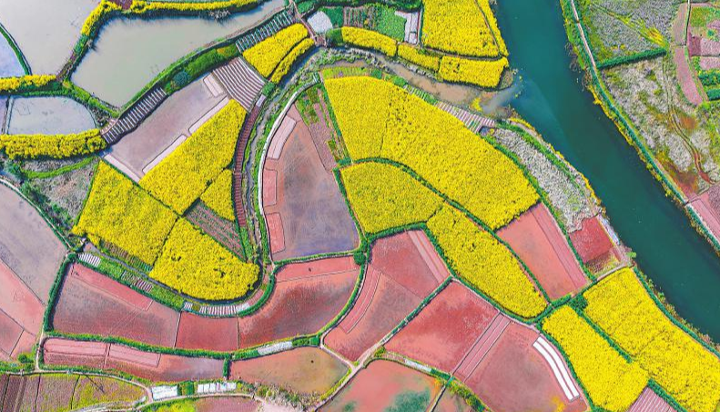 3月23日拍摄的资阳市安岳县岳阳镇凤型村农田。村民们整理的水稻育苗秧田和油菜花田形成了一道春日美景。张天富 摄(C视觉)