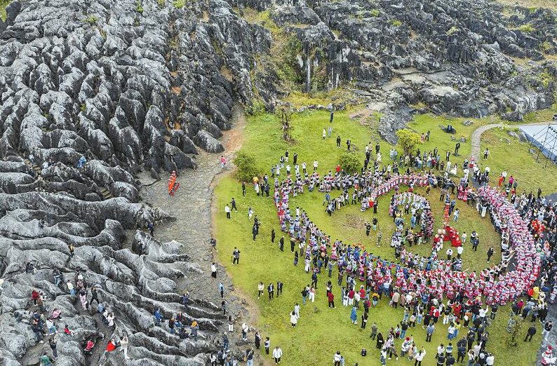 4月26日,省级非物质文化遗产——兴文苗族花山节传承展示活动,在宜宾市兴文县兴文石海景区举行。活动现场,苗族同胞身着节日盛装,跳起芦笙舞,参加巡游等传统民俗表演,吸引众多游客参与。