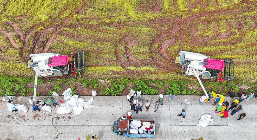 9月9日,在眉山市仁寿县板桥镇青龙社区,村民正在将刚收获的稻谷装袋转运。