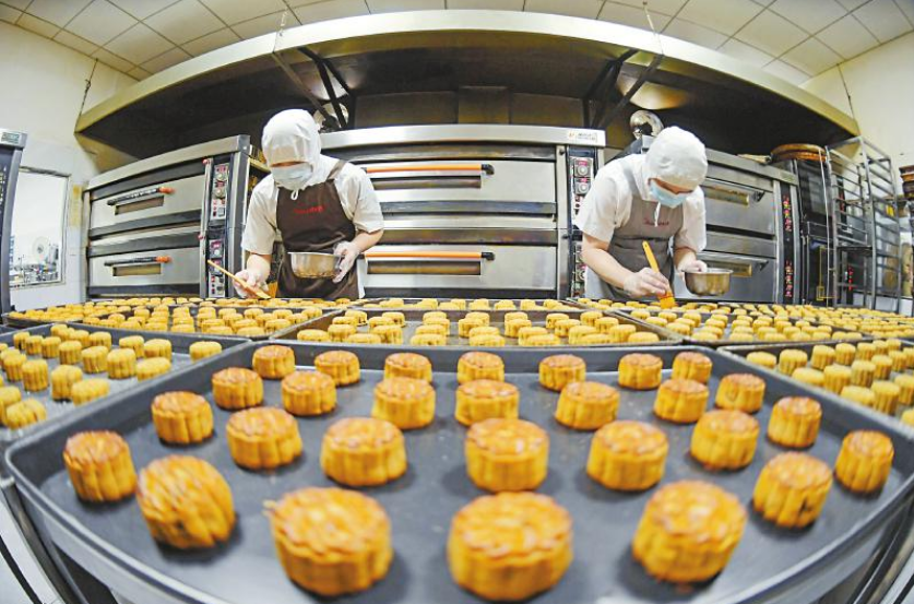 9月15日,成都市新津区保利得糕点坊生产车间内,工作人员正为传统手工月饼刷涂蛋液。随着中秋节临近,保利得糕点坊启动全线生产,工人们加班加点赶制订单,全力保障节日市场供应。今年,该店代表性传统手工月饼提前热销。月饼制作历经30余道工序、推出20多种风味,在传承经典的同时创新选用特色食材制作,受到消费者欢迎。 四川日报全媒体记者 李向雨 摄