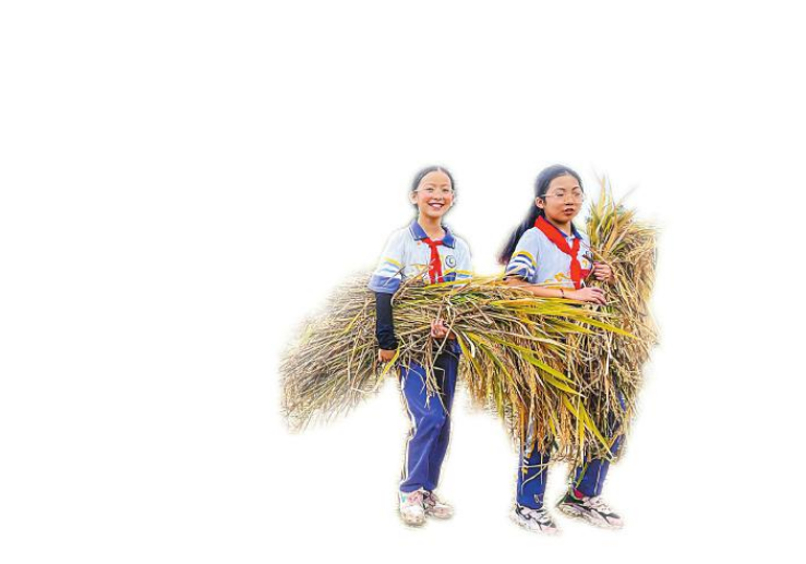 巴中市通江县第六小学的孩子们在“共享稻田”里收割稻谷。 程聪 摄(C视觉)