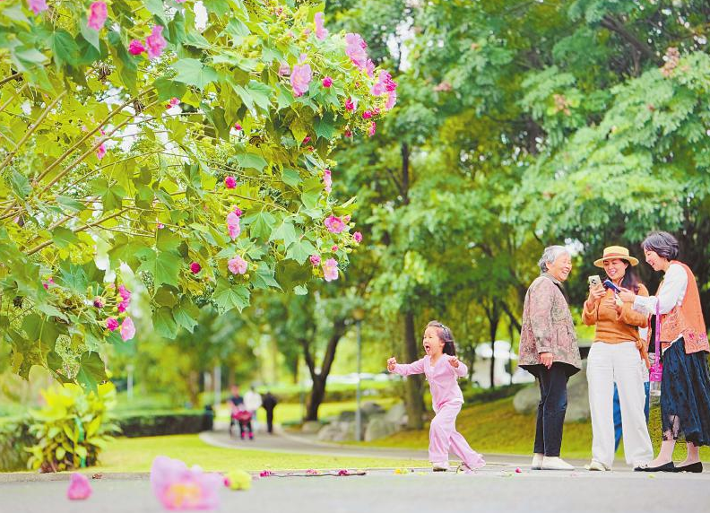 10月19日,成都市双流区白河公园内芙蓉花盛开,一家老小在公园游玩。龚榜玉 摄(C视觉)