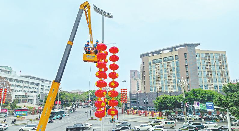 1月28日,德阳城建部门组织人员在市区主干道悬挂红灯笼,一串串火红的灯笼为街头增添了浓厚的新春氛围。