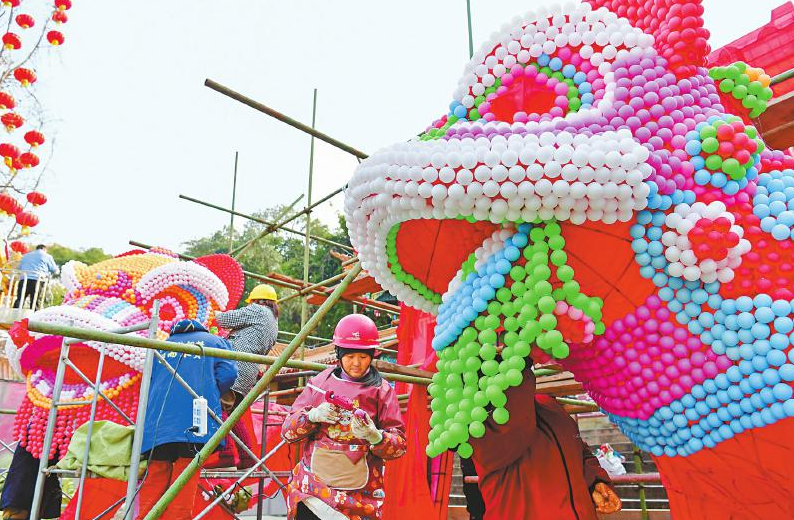 1月27日,绵阳城区公园广场,工作人员忙着组装象征吉祥与好运的迎新双狮。 王勇 摄(C视觉)