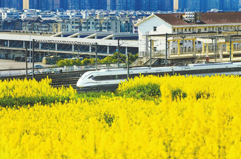 动车穿过雅安城郊的油菜花海。