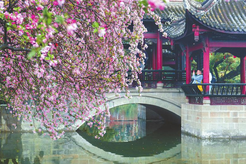 近日,成都市双流区棠湖公园的海棠花盛放,美景如画,吸引不少市民和游客前来打卡拍照。