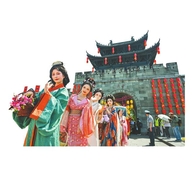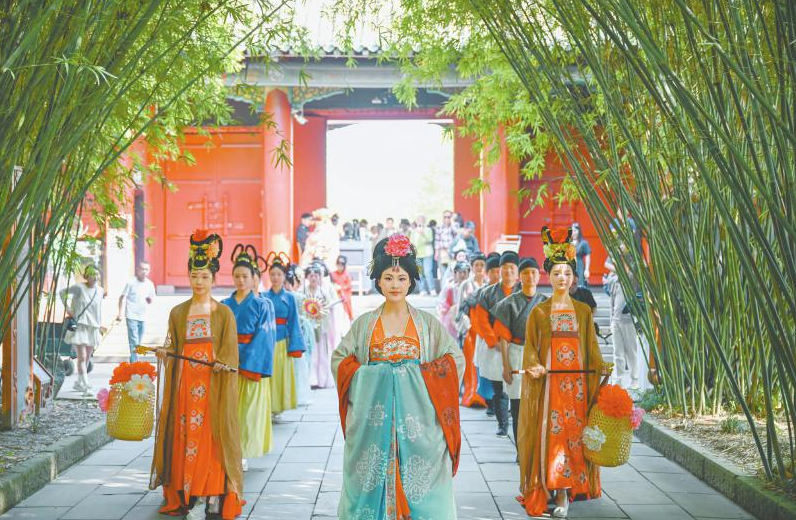 4月18日,“上巳传笺望江听涛”上巳雅集在成都市望江楼公园启幕,重现古老节俗。图为古装演员带领汉服爱好者们游园。四川日报全媒体记者 杨树 摄