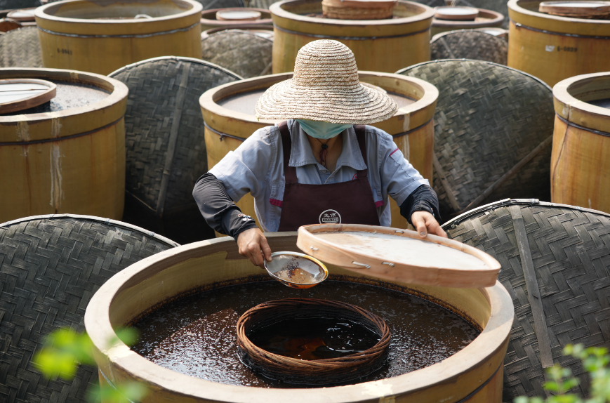 酿造工人正在查看酱油品质 周淼葭/摄