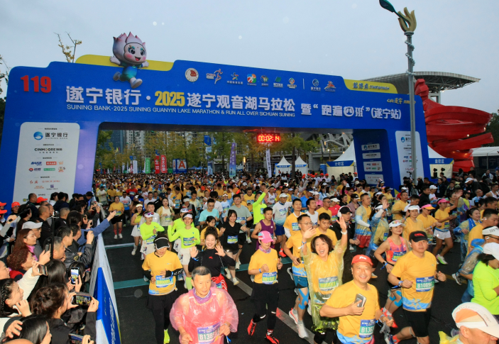近年来,遂宁利用体育场馆优势,大量承接国家级、省级体育赛事,如青少年足球赛、中甲成都蓉城队的主场比赛、全国青少年游泳锦标赛等,利用观音湖水资源优势,承接国家级龙舟赛、皮划艇赛等,实现了文旅体资源的有效利用。2025年11月9日举办的第三届遂宁观音湖马拉松赛事,路线95%串联依水而建的观音湖旅游度假区赛道,全国各地近两万名选手在奔跑间尽览水天一色,让每一步都成为沉浸式的视觉享受。同时,还联动全市景区、酒店和餐饮提供专属折扣,提升赛事消费转化率,形成“体育+文旅”的全域共振。