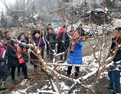 1月15日,记者抵达汶川县的当天,汶川县农牧局就在白雪皑皑的山间地头开展起了“两联一进”暨果树冬管培训会,当地村民也不畏严寒,纷纷来到樱桃果园学习农业知识。